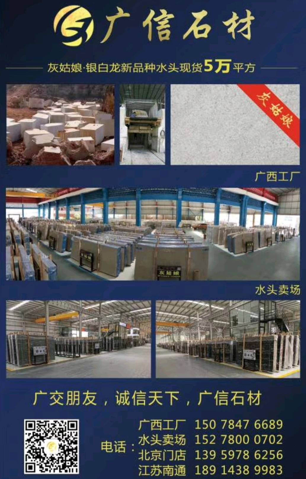 广信石材有限公司是一家集开采生产,加工,销售于一体的民营企业,主要经营天然大理石:灰姑娘,地中?;遥ù蟀澹醢?,规格板),雅士灰,银白龙,小米灰,美尼斯灰,新古堡灰,南极灰等各类天然大理石石材。主要销往以色列,欧美,韩国以及国内工程??笊匠Ъ抑毕?,广西工厂,福建水头,河北香河,江苏南通均有销售点,欢迎您来我们直销店或则广西工厂实地考察参观选购。
