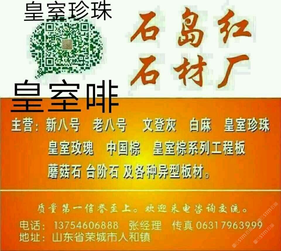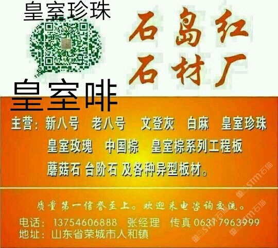 该企业尚未填写简介,请补充!山东石岛红石材厂主营 新八号 老八号 文登灰 白麻 皇室珍珠 皇室玫瑰 中国棕 皇室宗系列工程板 蘑菇石 台阶石 及各种异型板材。质量信誉至上?;队吹缱裳涣?。电话 13754606888 张经理 传真 0631 7963999。 qq 245382641