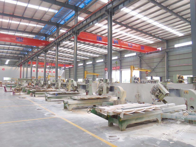 康典石业江苏有限公司位于南通东升国际石材产业城内,购置土地50余亩,占地面积: 34366m,厂房面积23000m,各类石材加工先进设备80多台(套),各类技术人员及安装工人500余名??档涫凳羌墓拭骋?、一次荒料加工、二次精品加工以及一流施工安装为一体的大型石材企业。\\\