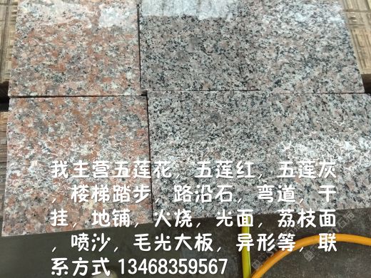 山东省青山石业有限公司主要经营 、五莲红 、五莲花 、五莲灰 、芝麻灰、蘑菇石、 马蹄石 、路边石 、磨光路沿石 、火烧板 、光板 、楼梯踏步 、圆球 、挡车柱 、罗马柱 、花坛石、 各种异型石等 ,真诚期待您的来电与合作。 厂址 :山东省五莲县石材产业园 微信电话:13468359567* 17563353123* 0633-3929188