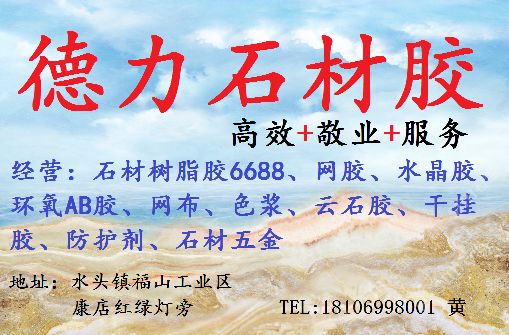 经营范围:石材树脂胶,透明胶,水晶胶,工艺树脂胶,薄板复合胶,防水背胶,台湾AB胶,网布,色浆,防护剂,意大利进口水性AB胶,云石胶,干挂胶,石材色差处理,外墙清洗