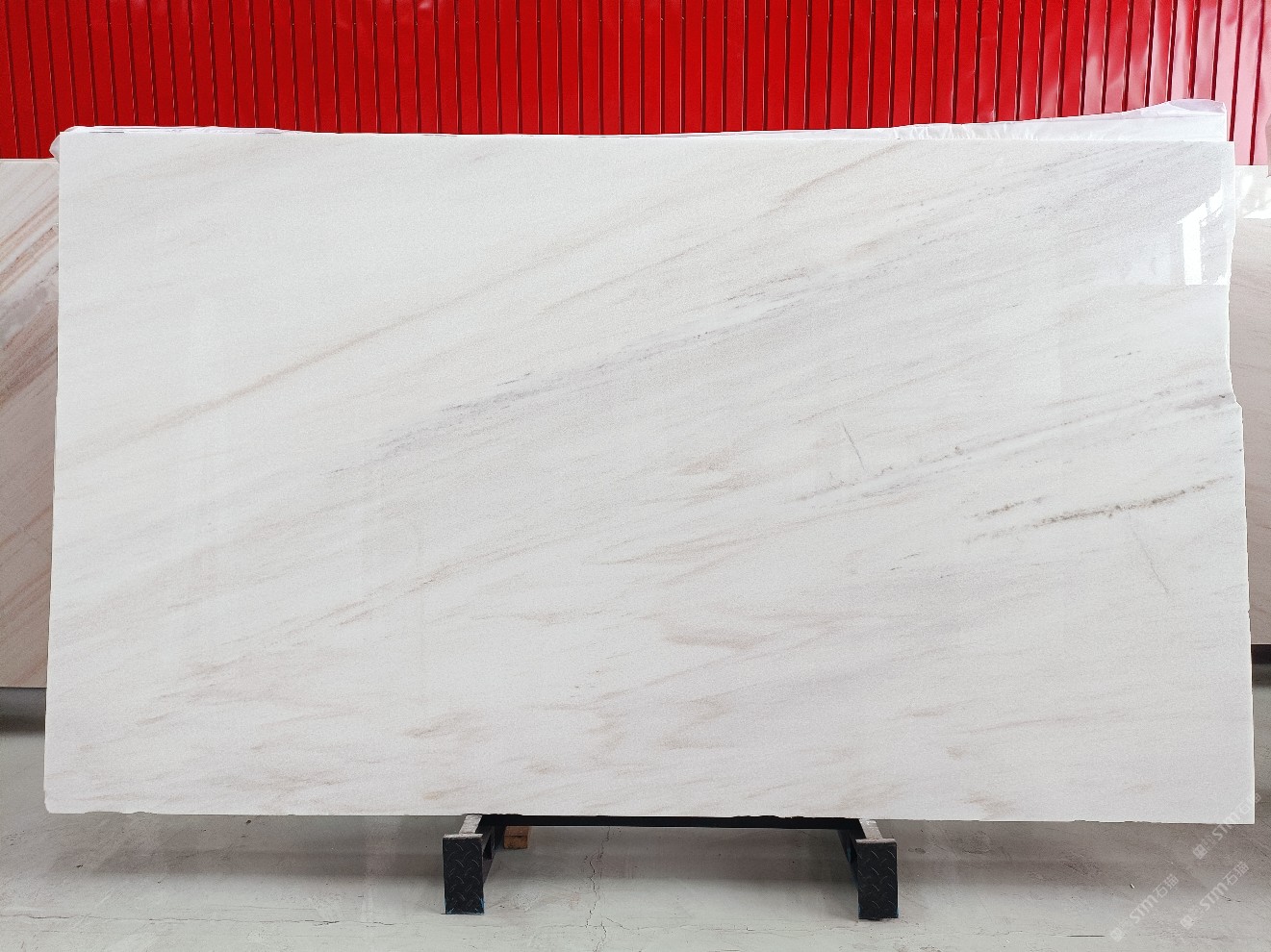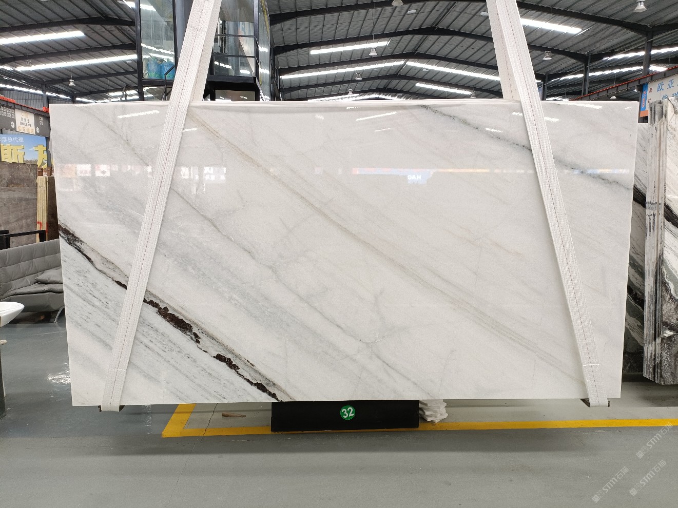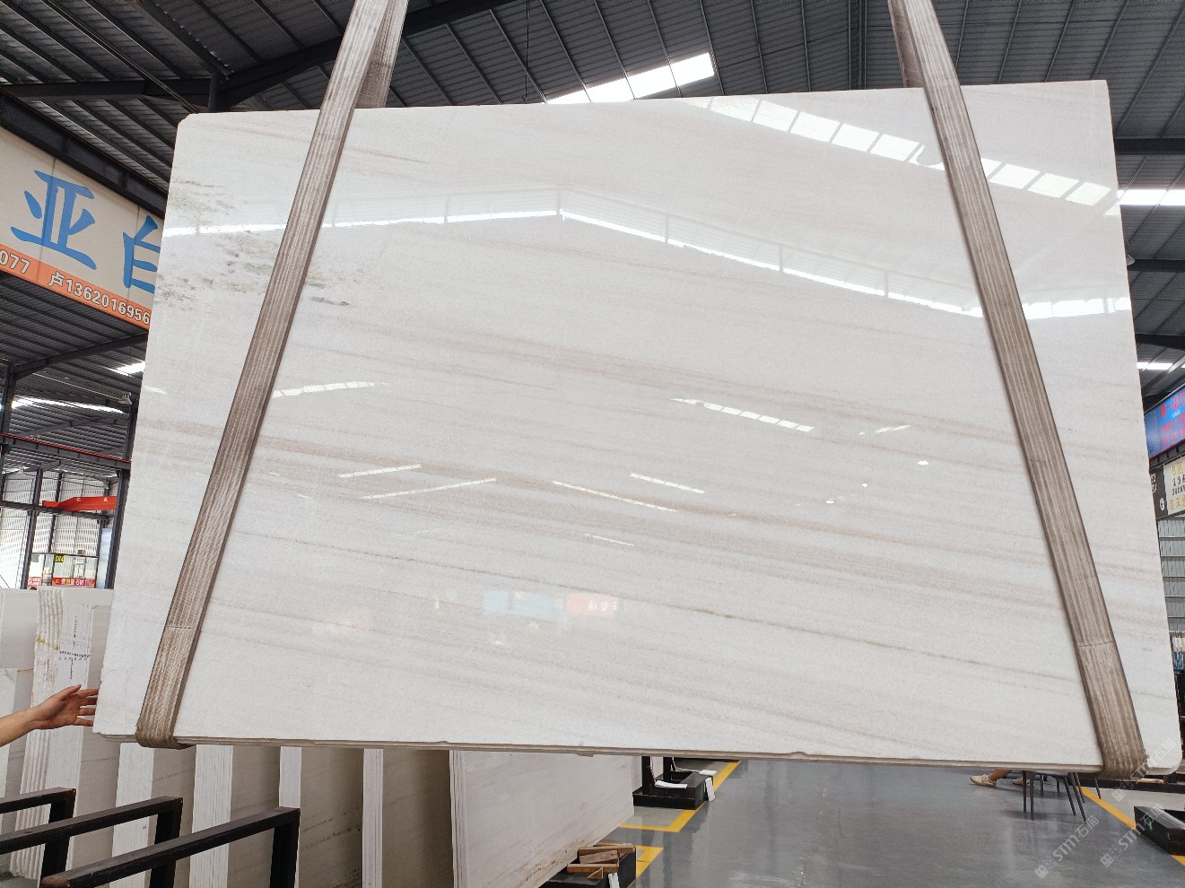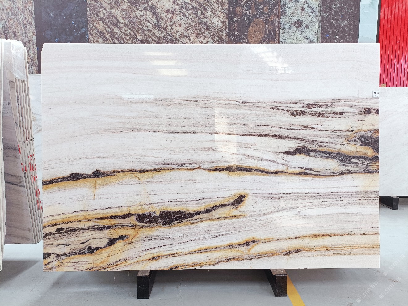 云浮站石材公司开发的欧亚白独立矿山,专属道路,矿口面积约 725 亩,证件齐全。今年矿口开采出直纹,乱纹优质大板材料,矿山采用单面墙平台开采方式,10台绳锯、5台铲车、5台勾机、一台 30 吨叉车,共有职工40人,已有两个开采平台。矿山已开采多年,道路、设施都已成熟,现产能稳定增长。品质非常稳定,一石两面分别可以产出直纹和乱纹两种纹路,材质为细腻的玉质品体。