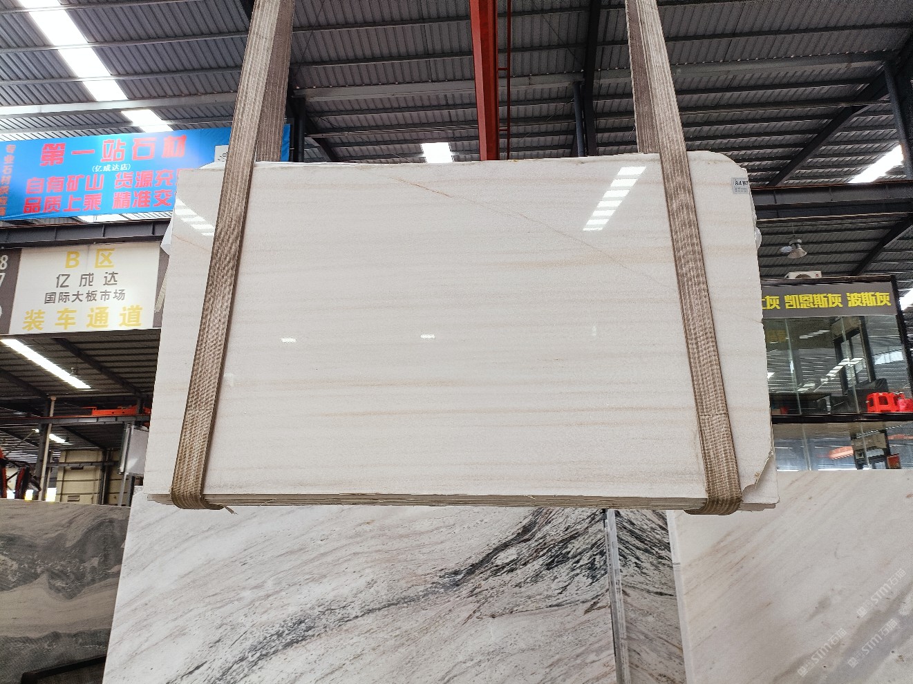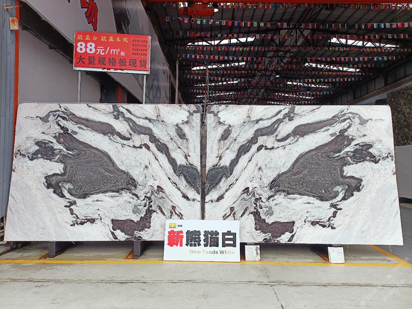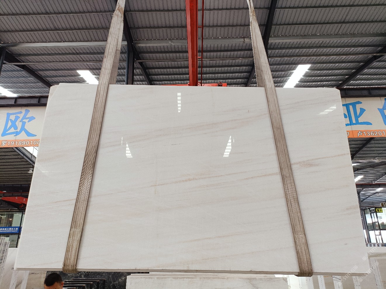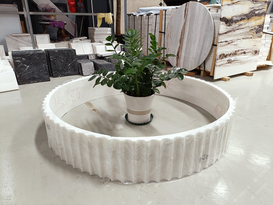 云浮站石材公司开发的欧亚白独立矿山,专属道路,矿口面积约 725 亩,证件齐全。今年矿口开采出直纹,乱纹优质大板材料,矿山采用单面墙平台开采方式,10台绳锯、5台铲车、5台勾机、一台 30 吨叉车,共有职工40人,已有两个开采平台。矿山已开采多年,道路、设施都已成熟,现产能稳定增长。品质非常稳定,一石两面分别可以产出直纹和乱纹两种纹路,材质为细腻的玉质品体。