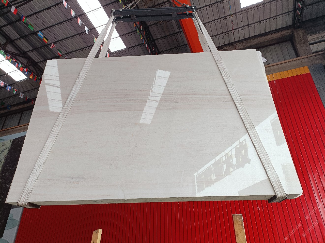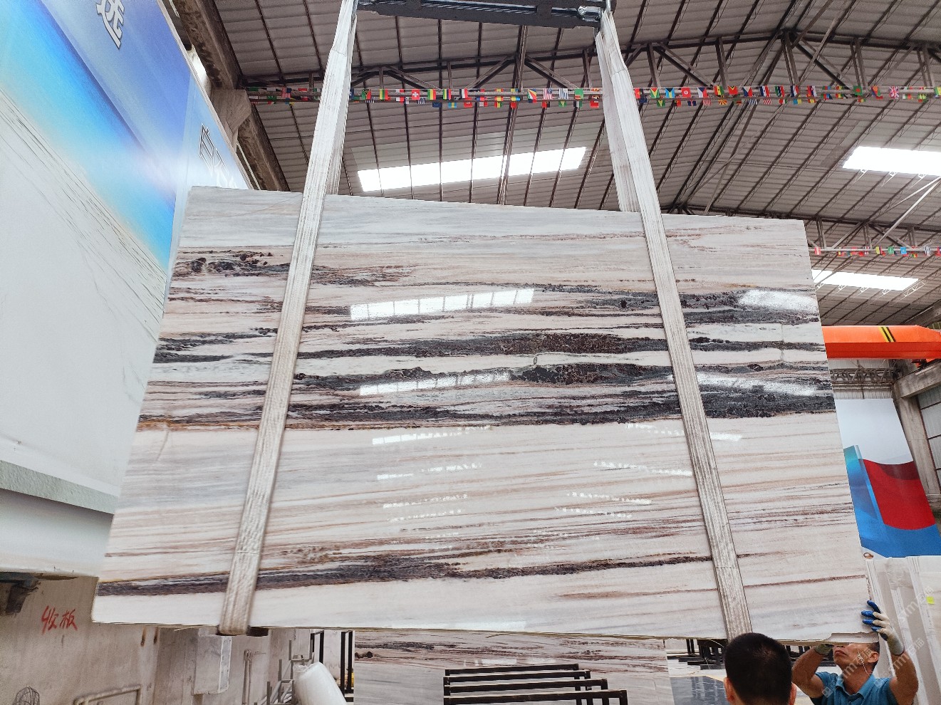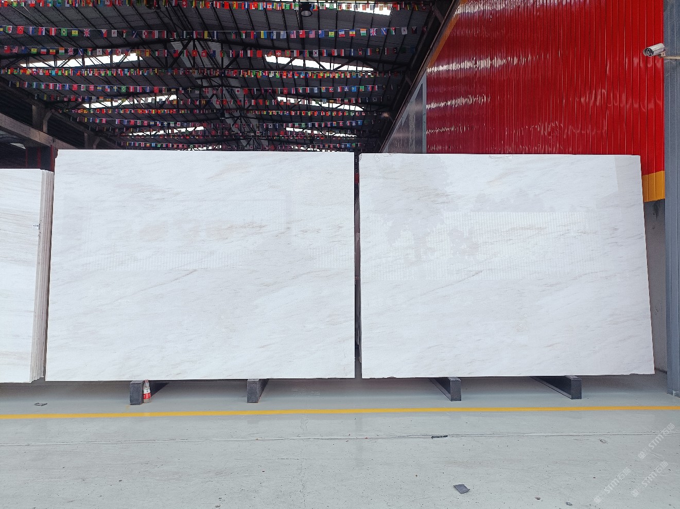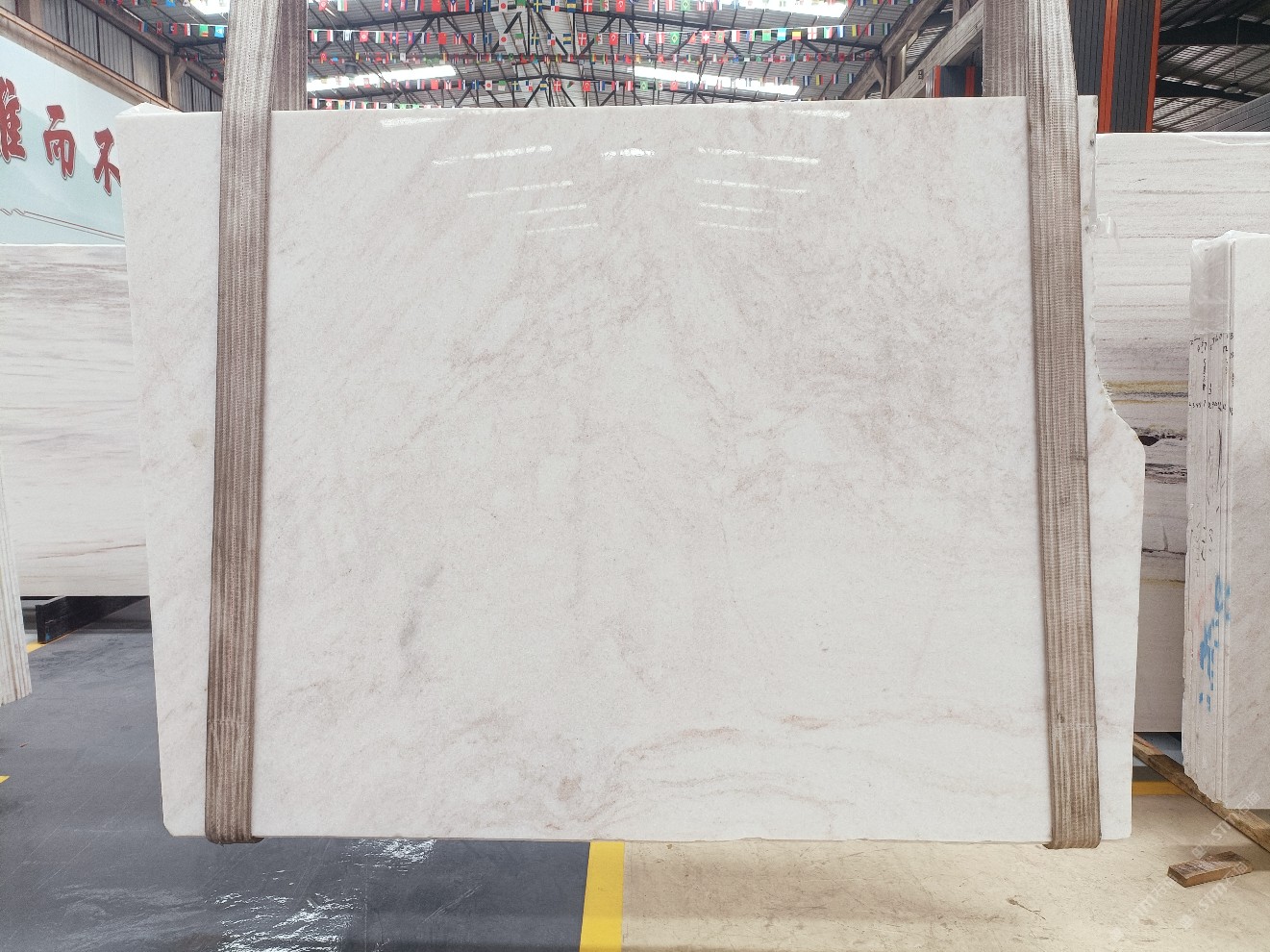 云浮站石材公司开发的欧亚白独立矿山,专属道路,矿口面积约 725 亩,证件齐全。今年矿口开采出直纹,乱纹优质大板材料,矿山采用单面墙平台开采方式,10台绳锯、5台铲车、5台勾机、一台 30 吨叉车,共有职工40人,已有两个开采平台。矿山已开采多年,道路、设施都已成熟,现产能稳定增长。品质非常稳定,一石两面分别可以产出直纹和乱纹两种纹路,材质为细腻的玉质品体。