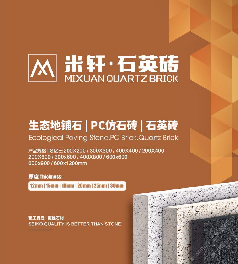 工厂主要生产:PC砖、生态地铺石,幕墙干挂仿石砖、园林景观砖、石英砖等。