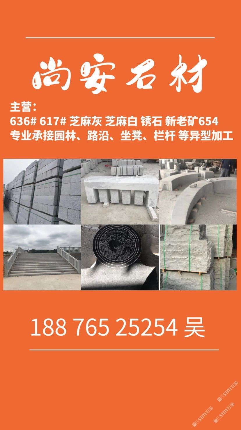 主营;新老矿芝麻黑 芝麻灰 芝麻白 锈石 636 617 专业承接 园林地铺、路沿石、坐凳.栏杆 自然面、菠萝面、蘑菇石、外墙干挂等异形 厚板加工