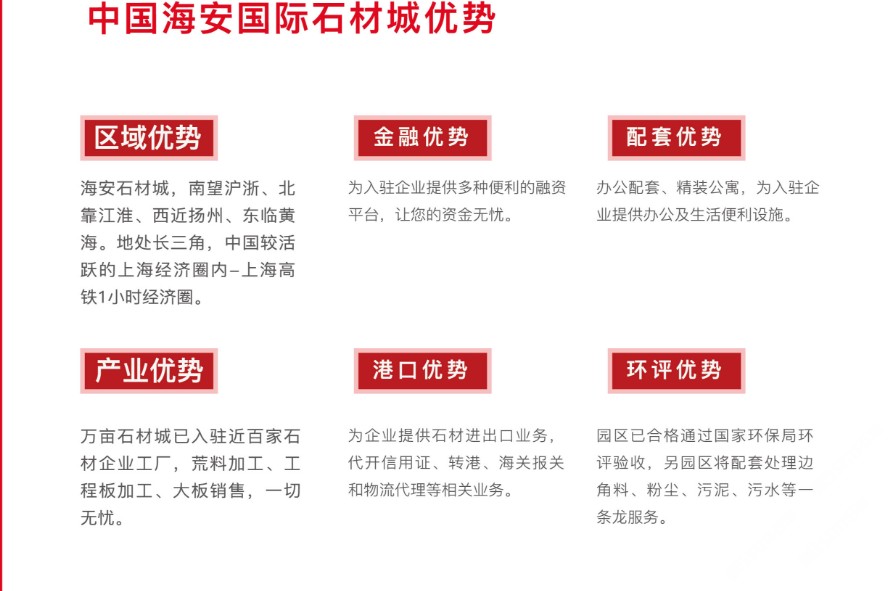 项目得到当地政府的大力支持,投入基础设施20亿元,主干道双向六车道已全面通车,绿化、官网、路灯、水电等七通一平已全部到位,达到一级城市主干道水平。石材城总占地面积15000亩,一期占地面积3000亩,规划总建筑面积约138万平方米,于2013年1月18日全面开工建设,目前已有80多家企业正式投产。