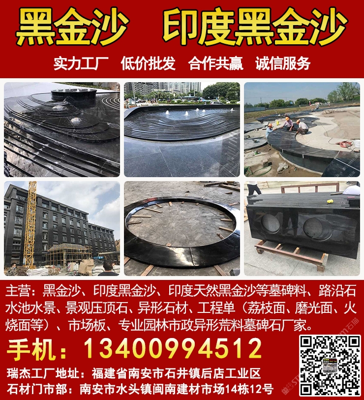 发布信息: 黑金沙水景工厂-瑞杰黑金沙林总13400994512主营:黑金沙、印度黑金沙、印度天然黑金沙、印度黑色石材、等墓碑料、路沿石、水池水景、景观压顶石、异形石材、工程单(荔枝面、磨光面、火烧面等)、市场板、专业园林市政异形荒料墓碑石厂家,实力工厂、低价批发、合作共赢、诚信服务. 工厂地址:福建省南安市石井镇后店工业区,门市部:南安市水头镇闽南建材市场