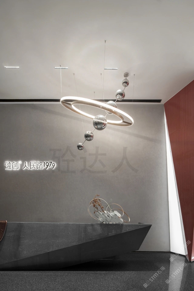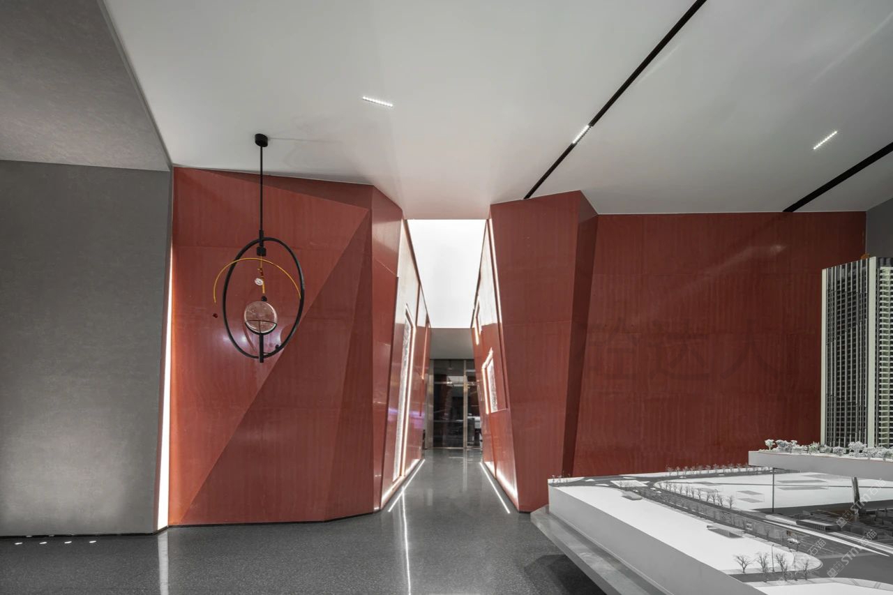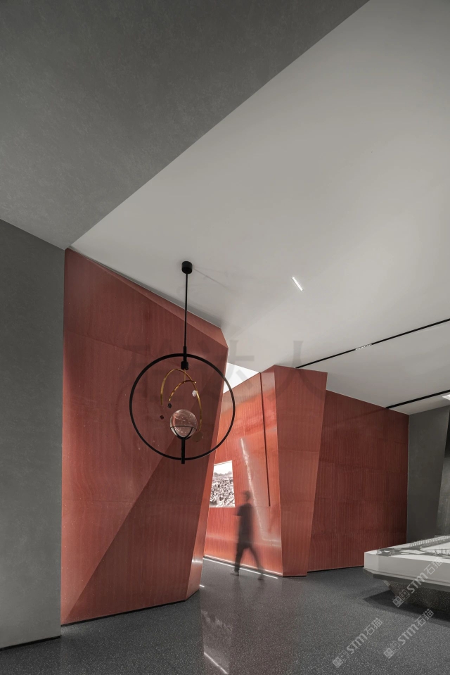 红色浅纹洞石运用室内墙面,异型拼接无缝处理