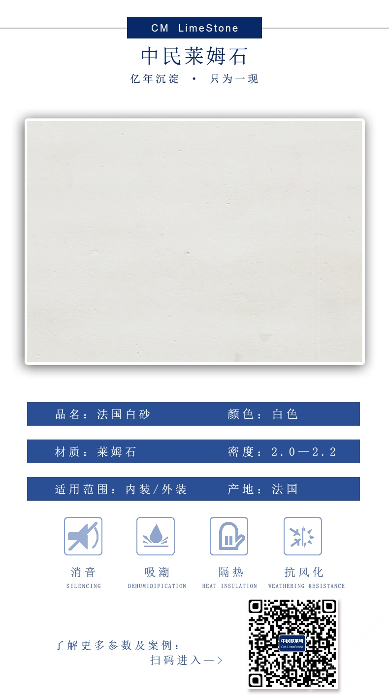 发布信息: 法国白沙莱姆石,超白系列,超细砂,是别墅内外墙不二之选,她手感细腻温润,质感强,可塑性高,吸音吸潮隔热效果!