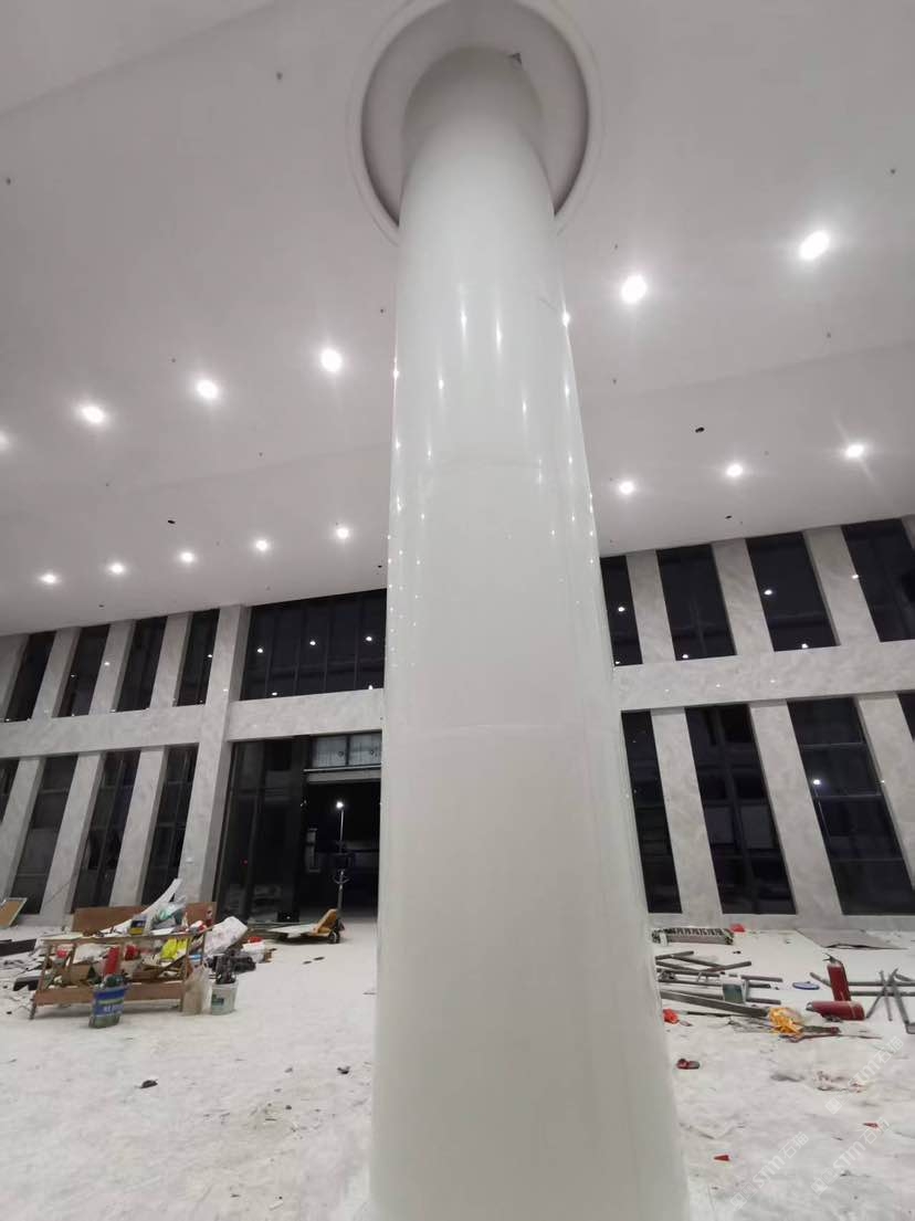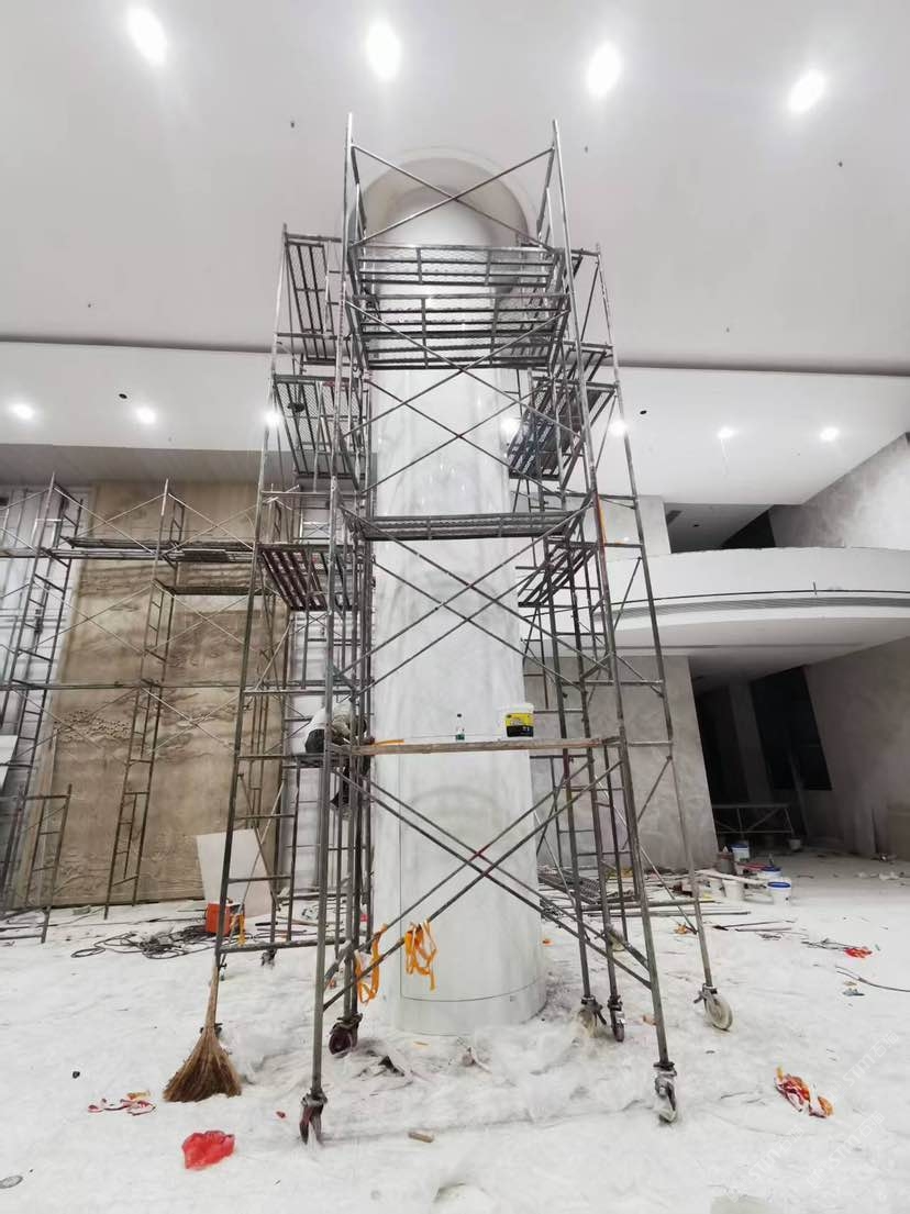 双马微晶石圆柱安装现场实景,以及流水桌面组装图