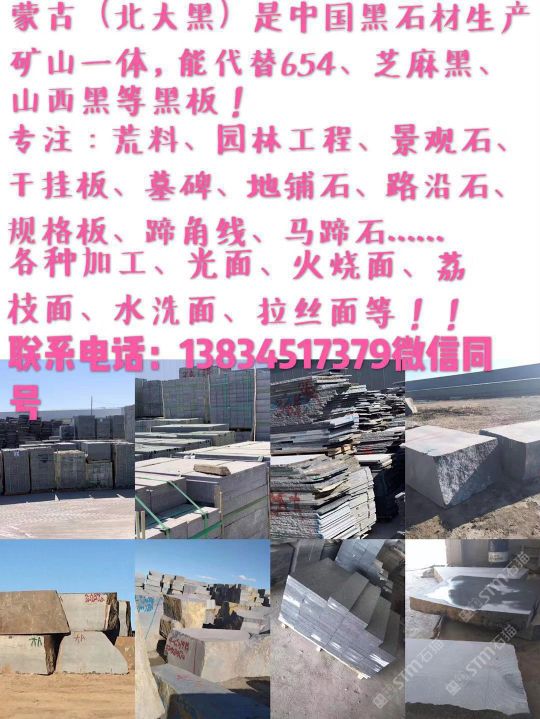 发布信息: 蒙古(北大黑)是中国黑石材生产矿山一体、能代替654,芝麻黑,山西黑:等黑板 ※诚信为本 专注:荒料,园林工程,景观石,干挂板,墓碑、地铺石、路沿石、规格板、蹄角线,马蹄石。 各种加工、光面、火烧面、荔枝面、水洗面、拉丝面等等! 电话:13834517379微信同号