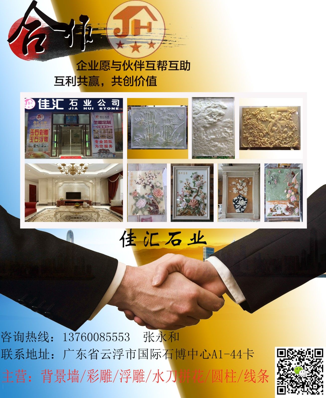 发布信息: 发布信息:全屋石材整装、玉石彩雕浮雕、水刀拼花、异形圆柱。联系电话13760085553(微信同号) 张生, 商圈名称:《佳汇石业》全屋石材整装、彩雕浮雕、水刀、异形圆柱