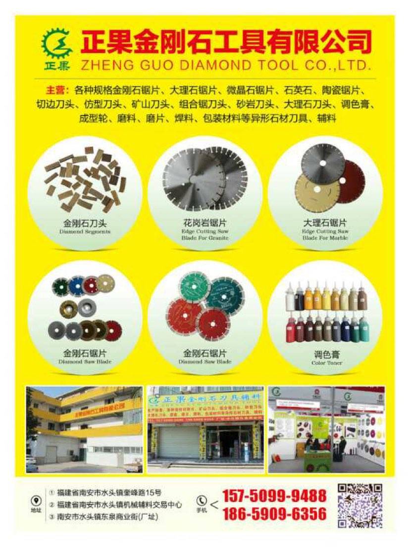 发布信息: 【工厂批发】各种规格金刚石锯片、大理石锯片、微晶石锯片、钎焊锯片、石英石、陶瓷锯片、切边刀头、仿型刀头、矿山刀头、组合锯刀头、砂岩刀头、大理石刀头、调色膏、成型轮、磨料、磨片、焊料、包装材料、电动工具及异形石材刀具、辅料 热线电话:15750999488 微信同号 需要私聊,欢迎来电!