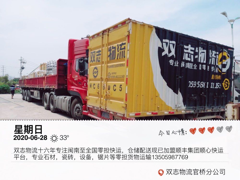 发布信息: 水头双志物流十六年专注闽南至全国零??煸耍忠鸭用怂撤峒潘承目煸似教?,专业石材、瓷砖、设备、锯片等零?;跷镌耸?。本物流专线福建到全国各地线路零担整车 运输业务,零担随时上门提货,天天发车,价格合理!专注全国石材瓷砖配件零担直达快运及闽南地区同城零担配送一日达,顺丰集团顺心平台各种零?;跷?0公斤起收,电商平台入仓,大件送货上楼,全国无盲区,十六年专业值得您的托付!公司秉承客户至上,服务的理念! 欢迎各位新老朋友来电洽谈! 手机微信同号:13505987769/15905908260李(女士)