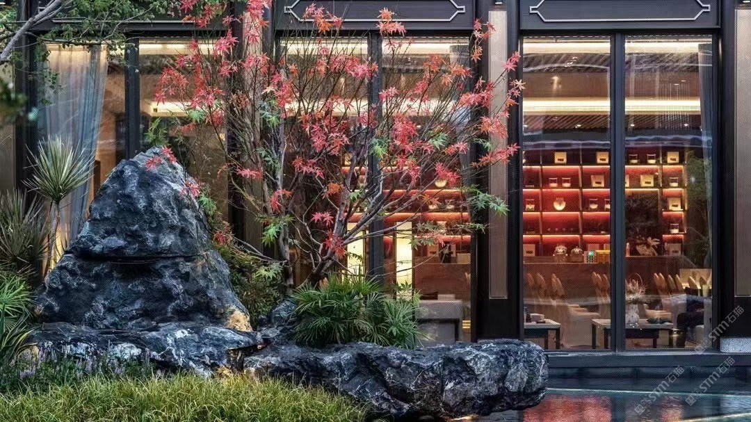 黑山石置石黑山石景观石应用,中式园林景观,