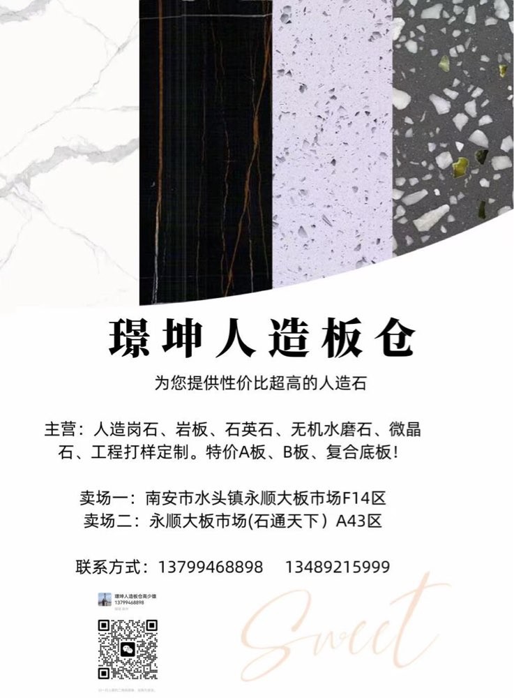 发布信息: 一璟坤人造板仓一 主营:人造岗石,石英石,岩板,无机水磨石, 微晶石,工程打样定制,特价A板,B板,复合底板 卖场地址:福建省南安市水头镇永顺大板市场A43区,F10一F14区。财富热线:13799468898高先生