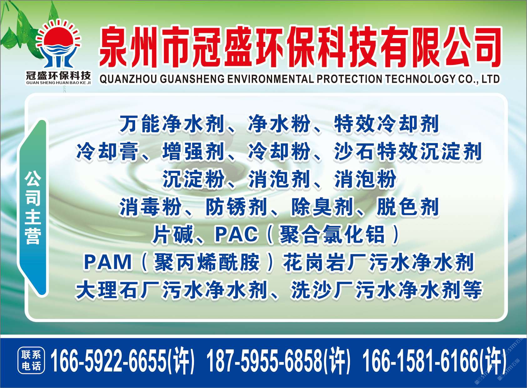 发布信息: 冠盛环??萍?8759556858 主营产品:净水剂,冷却剂,冷却粉,大理石人造石专用净水剂,沉淀粉,消泡剂,消毒净水剂,防锈净水剂,除锈剂,除臭剂,聚丙烯酰胺,聚合氯化铝,卤精,洗沙专用净水剂,压滤机专用净水剂,陶瓷厂专用净水剂(黄药 白药)等所有水处理环保材料……