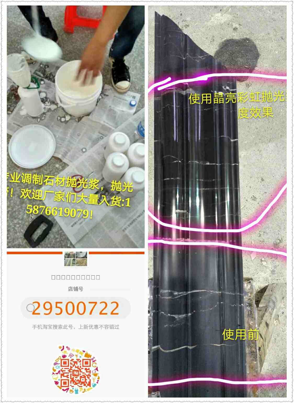 发布信息: (晶亮彩虹抛光浆)是掺进纳米颗粒的一种石材抛光浆,产品可渗透进石材内部形成玻化面。 抛光浆使用方法: 1、用(晶亮彩虹抛光浆)擦线条时,先用600砂纸在线条上搓几下,(如果线条磨到3号就不需要用砂纸搓,直接用抛光浆搓,就可以很亮了。) 2、使用前把瓶子倒过来,用力上下摇,让产品融合在一起。 3、再用半干湿毛巾或布沾本品用力来回搓个40秒。(要用点力搓) 4、搓完用另一块干净布或毛巾(一定要半干湿的)擦干净即可。(要一气呵成)(不用打蜡)擦完后立马晶莹透亮,形成?;妫换岱导?,不易退光,光泽度可保持二年。 温馨提示: 如有打过蜡的必须先把蜡用砂纸搓掉再使用抛光浆擦! 请戴上防水手套操作??! (晶亮彩虹抛光浆)[玫瑰][玫瑰]