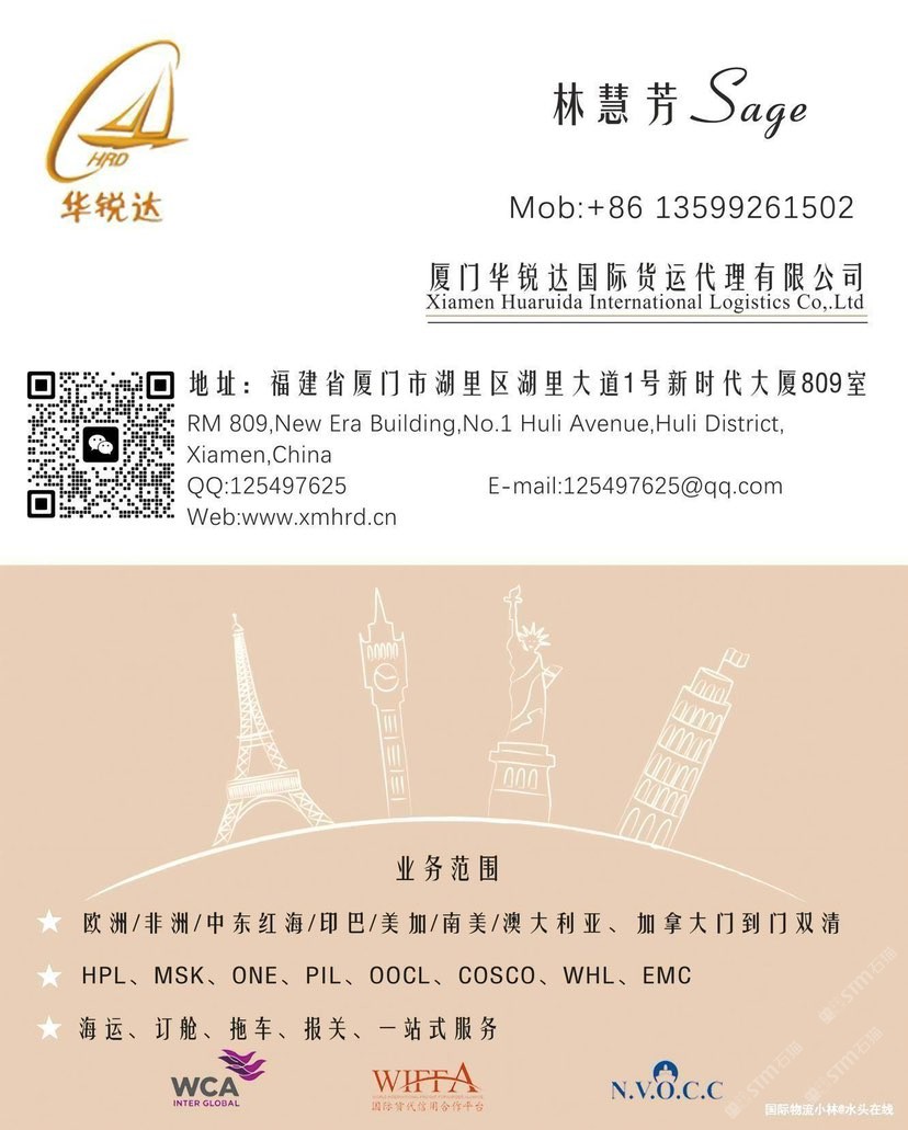 发布信息: 厦门华锐达国际物流专业石材国际运输服务,全面覆盖欧洲、非洲、中东、印巴(印度/巴基斯坦)、南美、澳大利亚及中亚五国等全球主要市场,确保您的石材安全、高效抵达目的地 欢迎询价13599261502