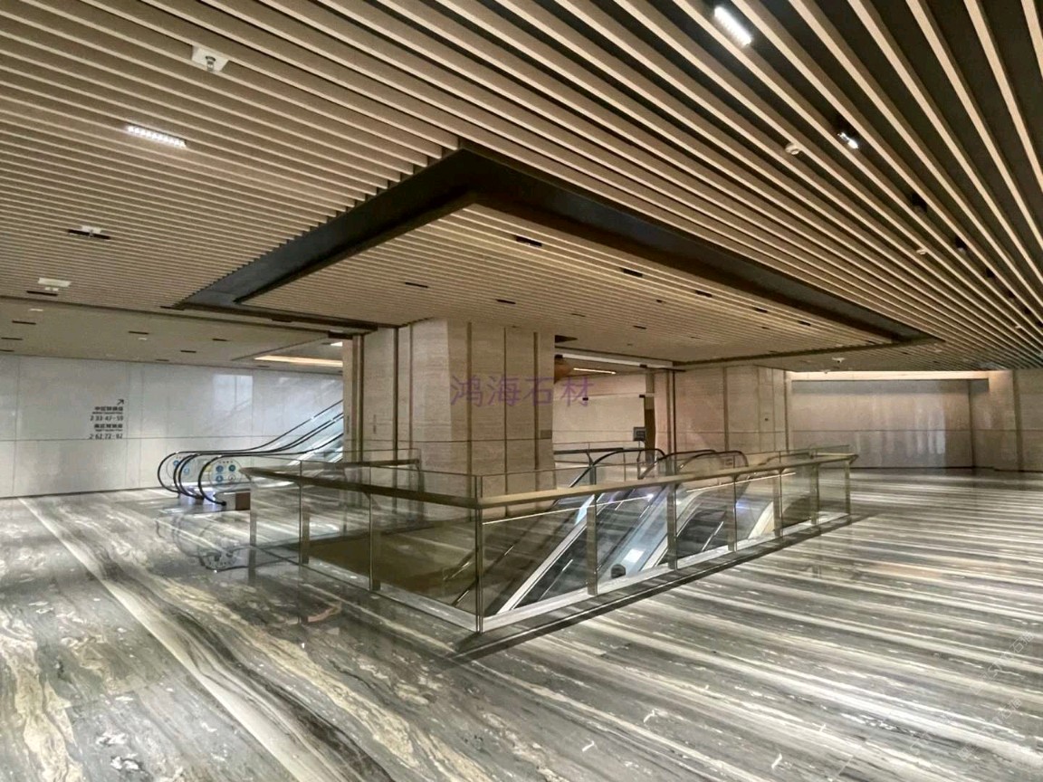 发布信息: 东莞国贸中心写字楼 #东莞写字楼#东莞国贸中心,地面石材铺贴纹理非常好看,石材纹理像河流浪花??,大堂墙面用浅色洞石材料,巨大的柱子用洞石做造型像树干,核心筒立面造型像石头,搭配地面灰蓝色水纹石材,寓意浪花击石;材料色调和谐,古铜金属面板提升造型精致度,金属质感与洞石触感的碰撞非常有意思;大空间里细节满满的设计。