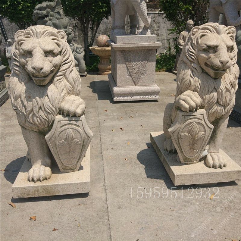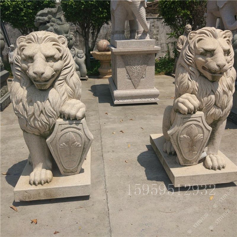 石雕黄绣石花岗岩西方盾牌石狮子动物雕塑