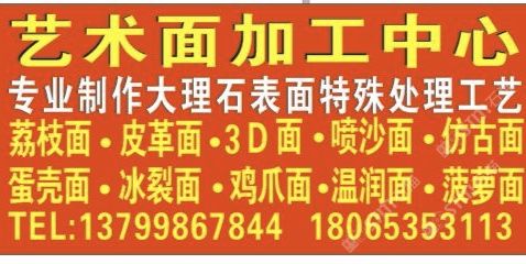 发布信息: 专业加工大理石荔枝面,拉丝面,3D面,皮革面,喷砂面,蛋壳面,鸡爪面,冰裂面,菠萝面,温润面,仿古面,联系电话18065353113,