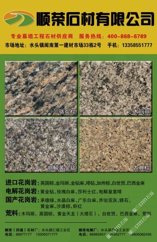 发布信息: 市场地址:水头中闽市场综合楼20~23号 花岗岩厂址:水头镇仁福工业区顺荣石材 精加工厂址:水头镇滨海工业区顺荣精加工 联系:13358551777许自在, 18606984789王燕燕,