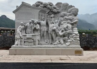 石雕 芝麻白红色主题雕塑。