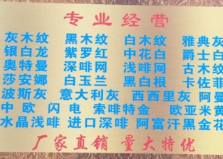 东升大板市场主营产品:龙舌兰,玛瑙金黄,克罗地亚,兰多哥,中欧米黄,银灰洞,伊朗绿,红线莎安娜米黄,新中欧米黄,新玛瑙金黄,紫莎红,云彩木纹,伊朗粉红,金龙米黄2,意大利蓝金沙2,西雅图米黄,蓝色妖姬,希腊木纹1(反切),富贵金花米黄,西雅图木纹,0°黑(乱纹),0°黑(直纹),古典灰1,霸王花,维纳斯金(意大利金花),爵士白,水晶白,希腊白木纹,银海浪,海浪灰,波涛灰,意大利海浪灰,金丝木纹2,紫金白玉,七彩山水画,山水画,山水画1,诺贝尔灰(新海浪灰),幻彩玉,热带雨林,美洲绿,紫罗红,东方白,奥特曼,罗马洞石,阿富汗黑金花,爱奥尼灰(彩云金灰),云多拉灰13,欧亚木纹,啡慕斯企业地址:福建泉州南安市水头镇东升大板市场