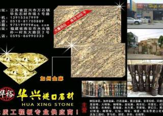 华裕(华兴)石材主营产品:加州金麻,加州金麻(黑底),紫点金麻,紫点金麻1,浅紫点,美国白麻,美国灰麻,金山麻,世贸白,芭蕉黄1,安哥拉黑(黑水晶),安哥拉棕,安哥拉棕3,蓝珍珠(11号矿),银珠,绿星1,巴西金麻,海蓝宝,印度兰1,乌克兰幻影蓝企业地址:福建南安水头镇朴一村东大路区2号