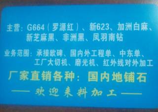 厦门高厝楼进出口有限公司主营产品:漳浦锈,漳浦虾红,漳浦红G648,G684(火烧面),新G684,中国黑,蒙古黑,沙漠棕,天鹅白,G623,G688,虎皮白,虎皮红,罗源红G664企业地址:福建南安丰隆加油站往水头方向200米处