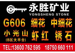 永胜矿业主营产品:象牙白(光面),象牙白1,G606,黄锈石,霞红,G606(副矿),G606(砻石),G606(正矿),虾红1,锈石2,锈石(荔枝面),黄锈石(荔枝面),锈石,虾红,虾红G681,虾红荔枝面,G681,G681虾红(光面)企业地址:福建泉州南安市联合二路汇创物流园